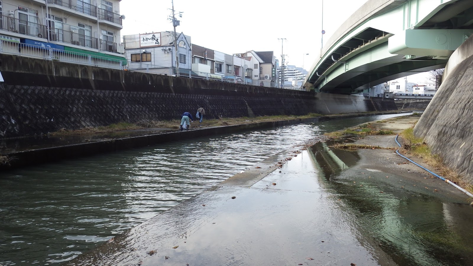 真冬の川の中は、時折、水鳥が飛び立っていましたが、魚の姿は見えませんでした。高水敷では、早くも雑草の緑がチラホラ顔を出し、自生している水仙が可憐な花を咲かせていました。