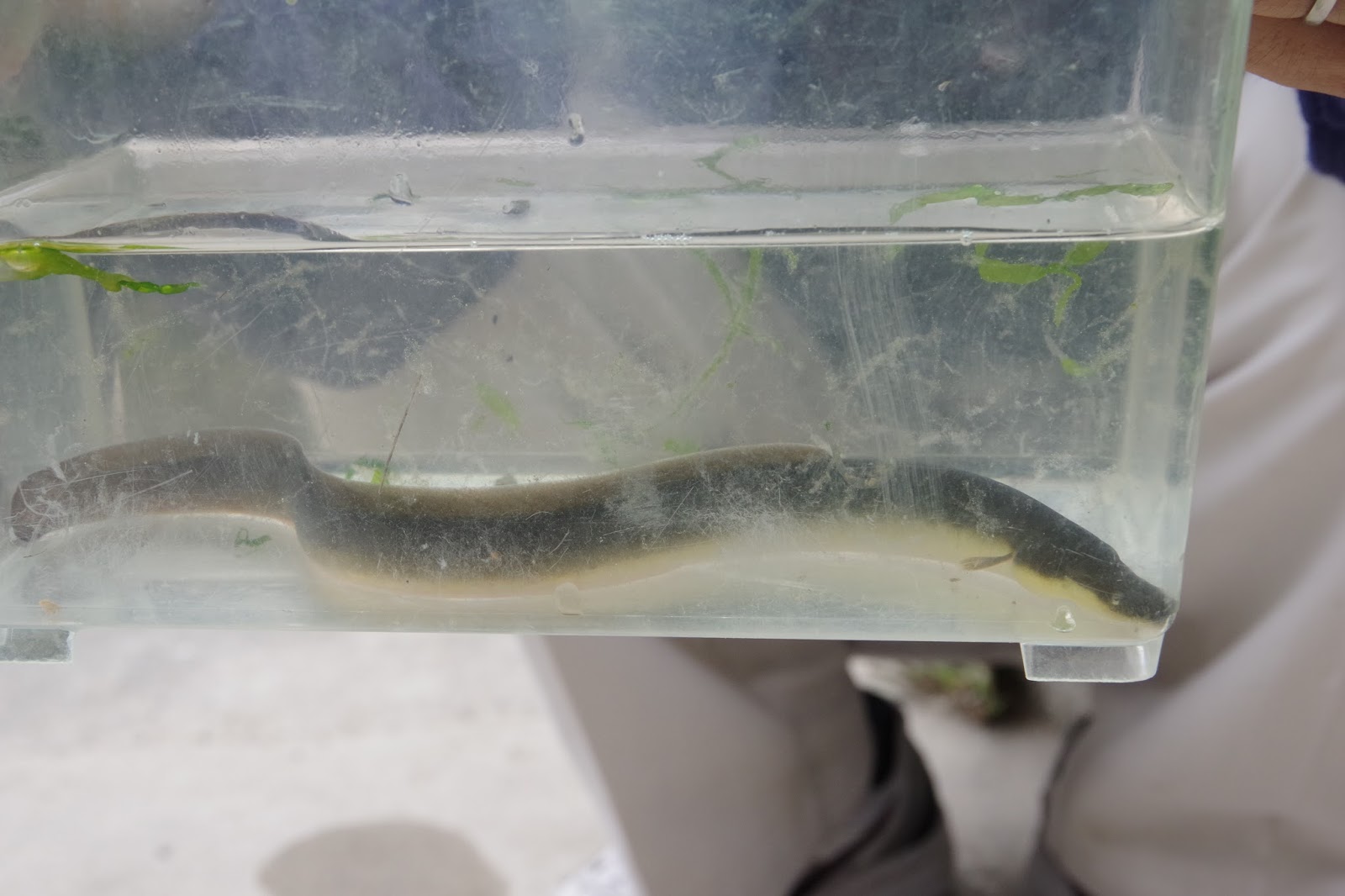 最後の、下流域では、4つのモンドリが全てボウズで、残念な結果に終わるかと思いきや、メンバーの中西さんが、たも網で岩間から体長25センチのウナギの大物を捕まえました。これまでの調査で最大級です。さらに成長して、天然ウナギの子孫を成してもらいたいものです。